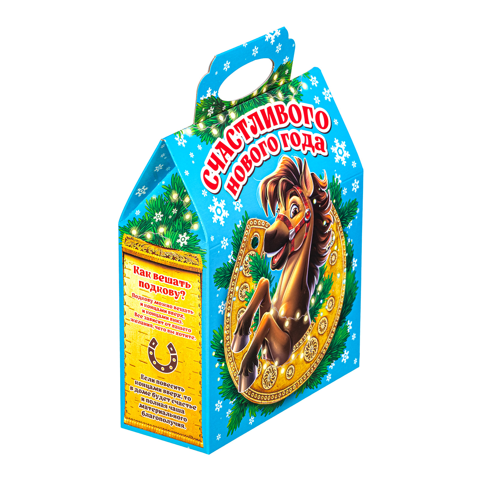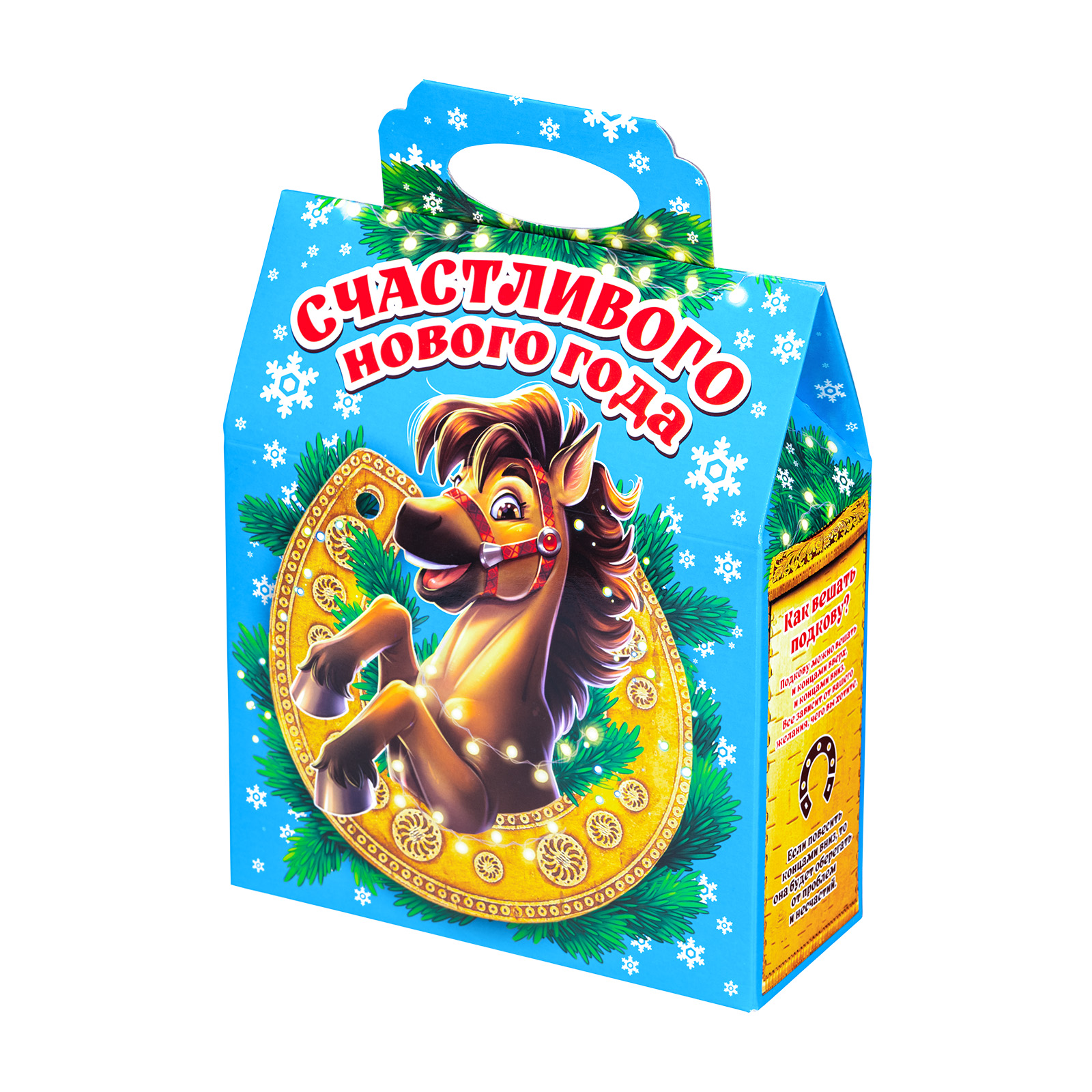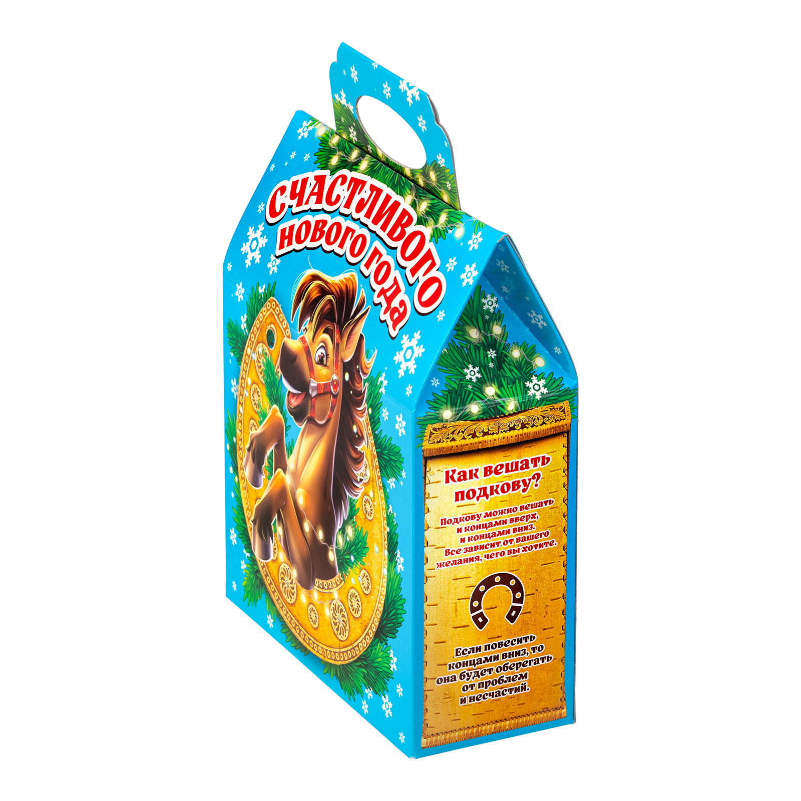 Новогодние сладкие подарки в картонной упаковке, благодаря своей практичности уже не первый год пользуются спросом. Набор “Гришаня” - это прекрасный выбор подарка для праздника в школе или детском саду. 700 грамм разнообразных вкусных сладостей, бережно упакованных в небольшую яркую коробочку с удобной ручкой - что еще нужно для счастья! Упаковка по форме напоминает небольшой почтовый ящик светло-голубого цвета. На передней части есть яркий рисунок с символом наступающего года - задорным жеребцом, выглядывающим из большой золотистой подковы. Подкова с древних времен считается мощным оберегом для дома, поэтому сбоку есть небольшой справочный материал, который позволит вам узнать нечто большее об этой занятной вещице. Так что иногда сладости могут быть не только вкусными, но и полезными!
