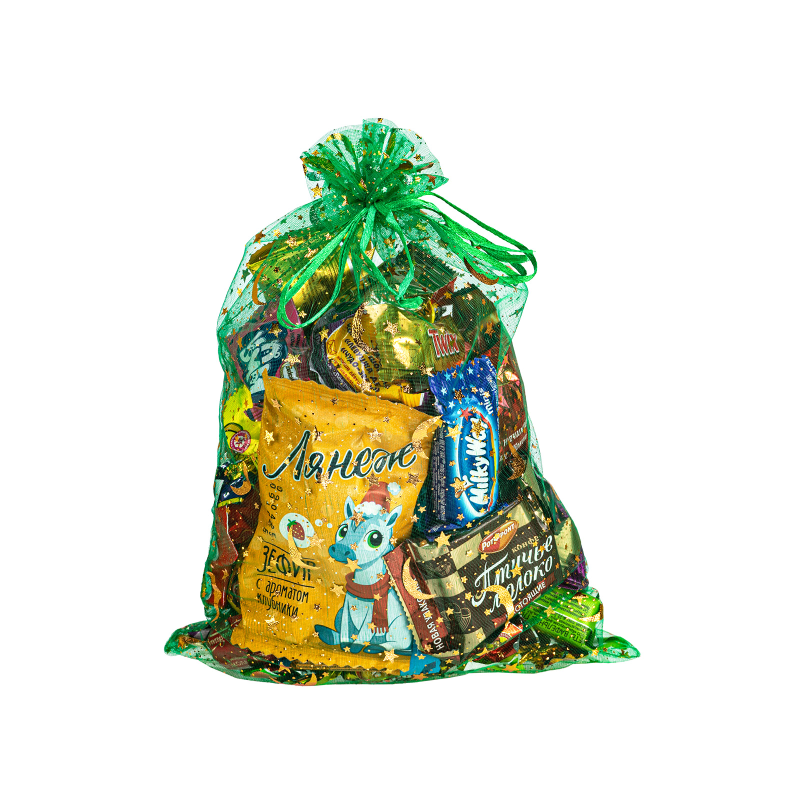 Новогодние сладкие подарки в текстильном мешочке - универсальный выбор, если речь идет о новогоднем празднике в школе или детском саду. “Лунная ночь” - это компактный бюджетный подарочный набор, упакованный в зеленый текстильный мешочек, сверху надежно перевязанный веревочкой. В состав подарка входит входит 500 грамм разнообразных кондитерских изделий на любой вкус: желе, бисквиты, батончки, шоколадные конфеты и многое другое. Также в мешочке можно найти небольшой памятный сувенир в виде символа наступающего года - очаровательной грациозной лошадки.