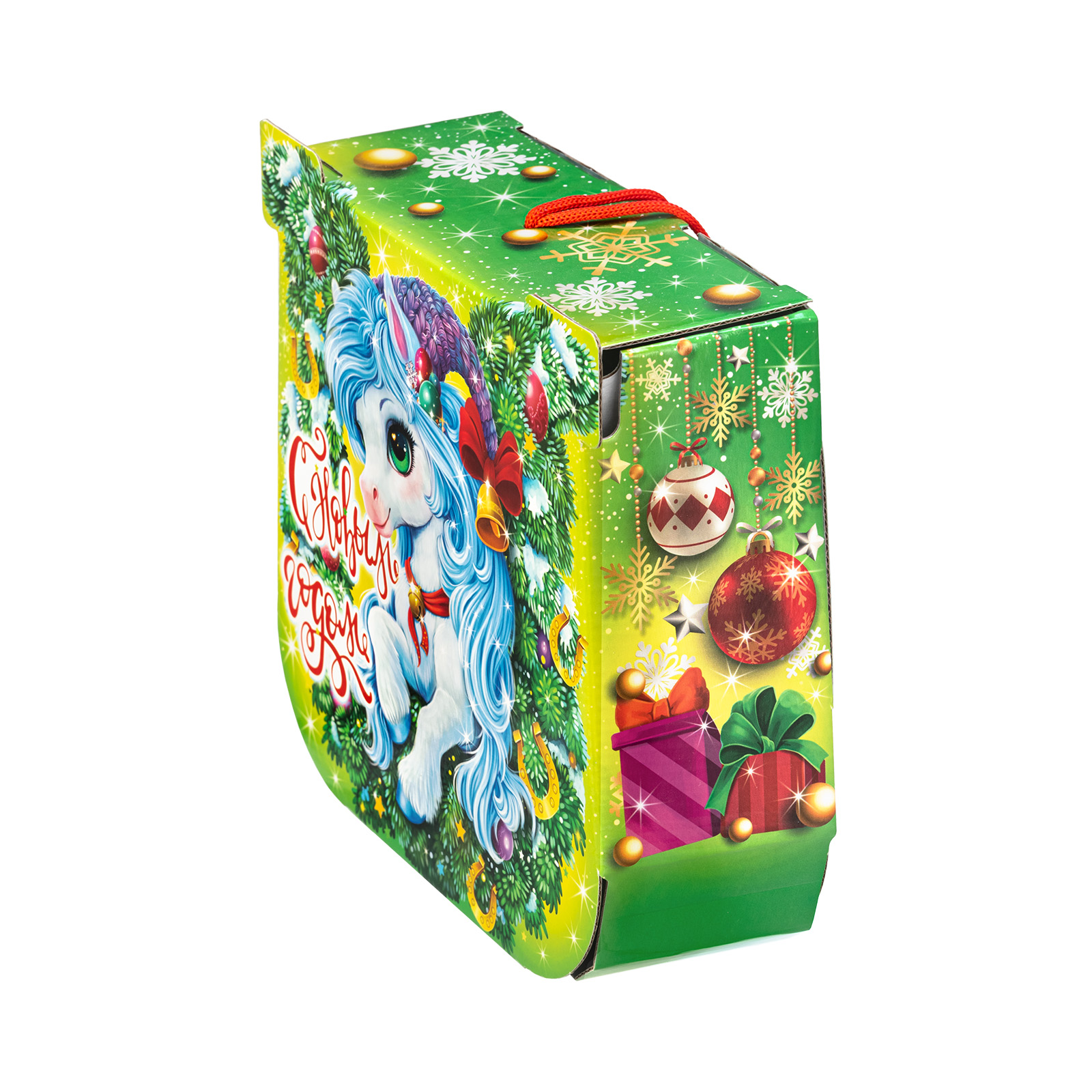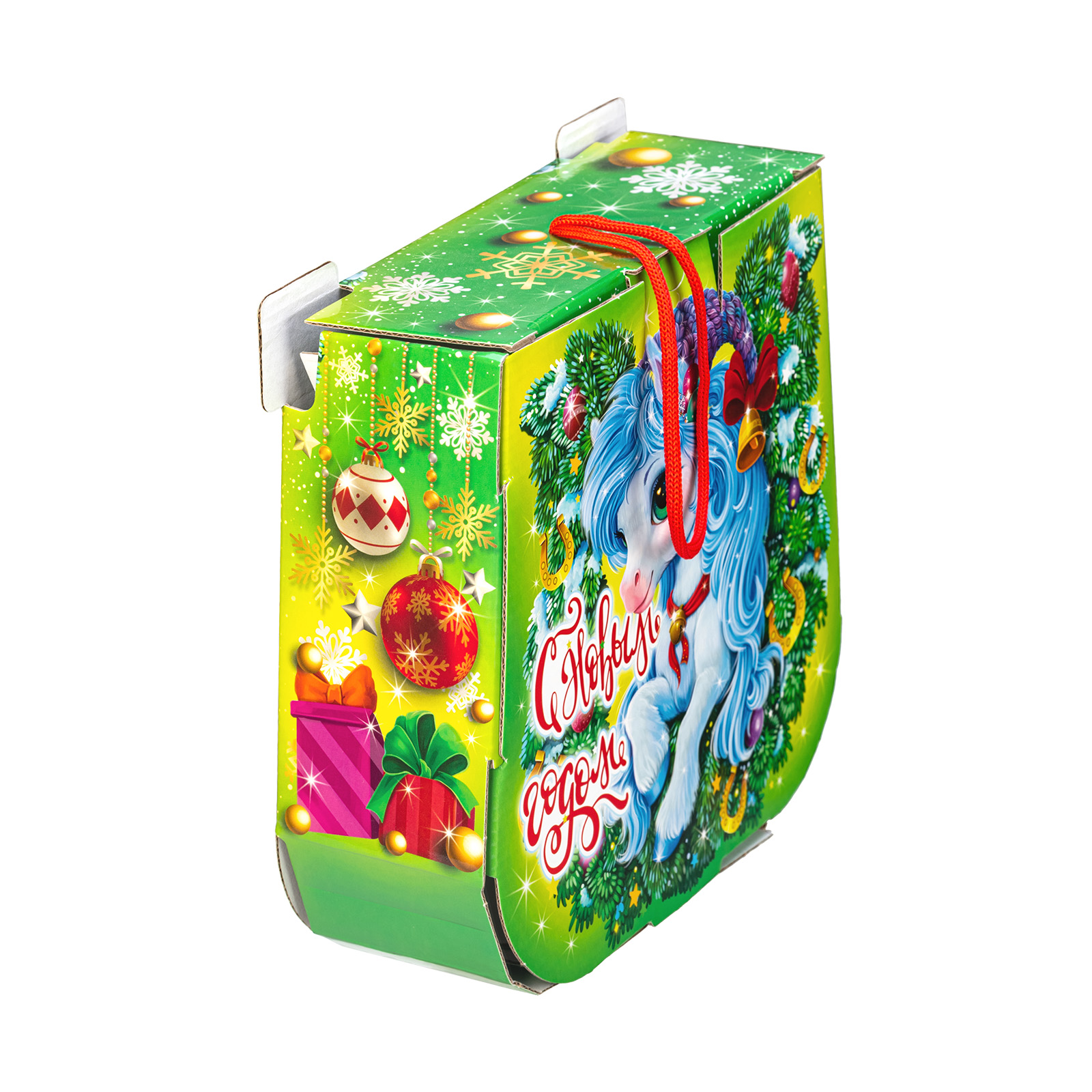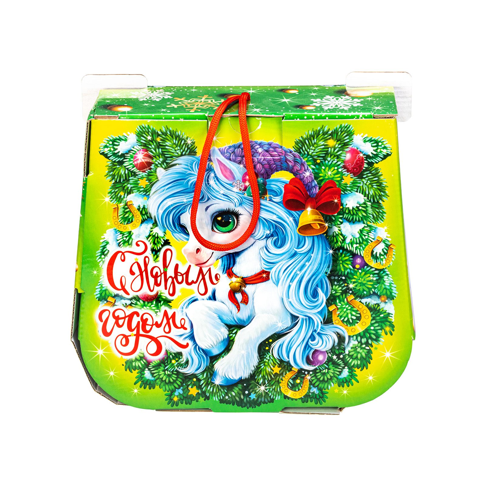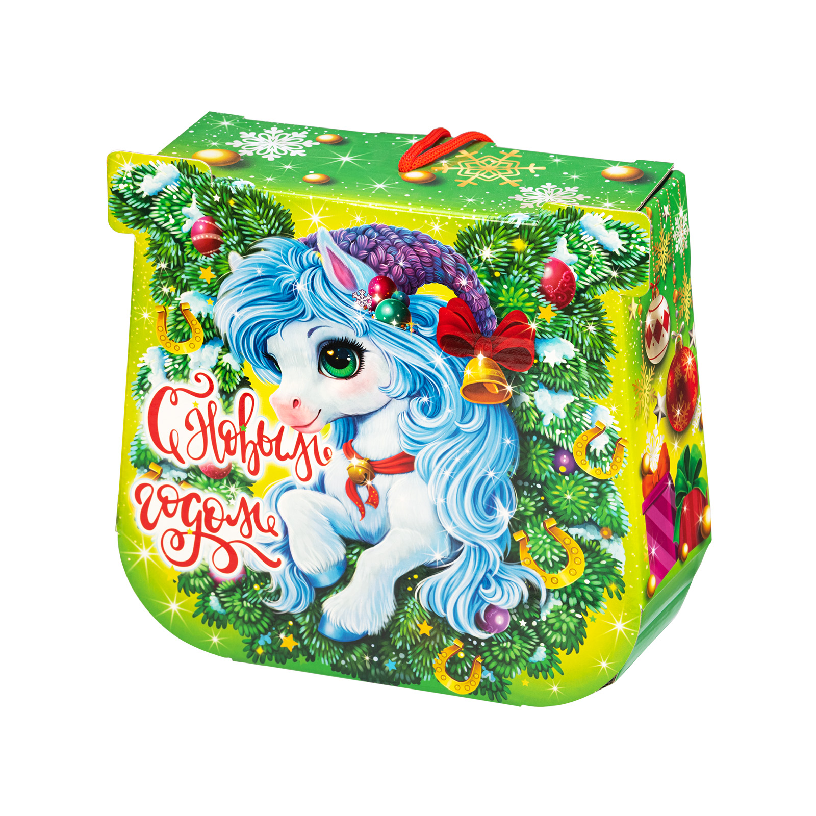 С древних времен подкова считается символом удачи, а также надежным оберегом от всех бед! Так что если хотите сделать кого-то счастливым, то подарите ему этот подарочный набор. Небольшая картонная коробочка с удобной ручкой легко вместила в себя россыпь вкусных и разнообразных сладостей, которые скрасят любой новогодний стол. Помимо сладкого наполнения в состав этой волшебной подковы входит небольшой памятный сувенир, который поможет надолго закрепить приятные воспоминания об этих замечательных новогодних праздниках!