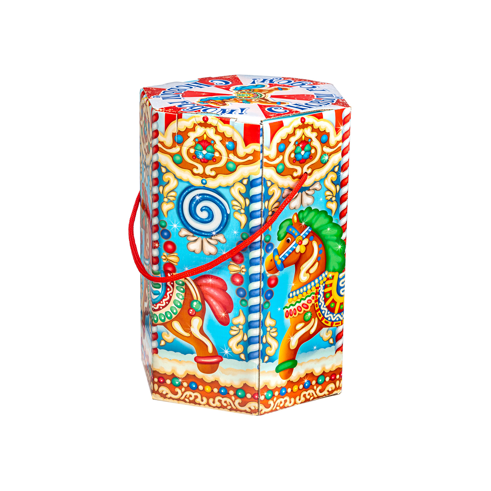 Интересный вариант новогоднего подарка – «Пряничная карусель». Он представлен в разделе Картон. Отлично подойдет на подарок в 2026 году с символом Лошадь. Внутри такого презента находится кондитерский набор весом 800 граммов.